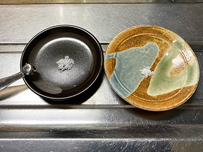 左が計量スプーンの塩少々。
