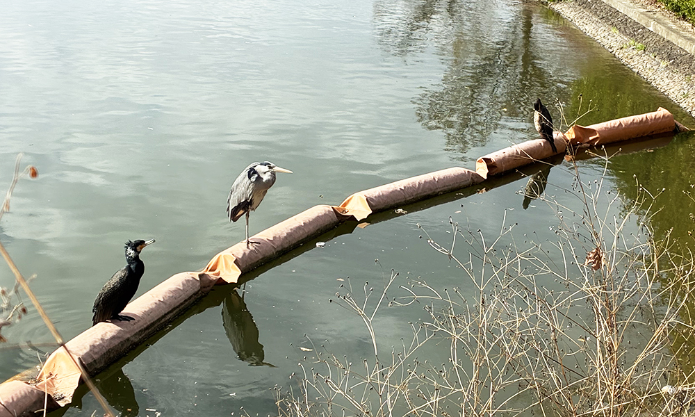公園の池にいたオオアオサギとカワウと…奥の子はわからない……