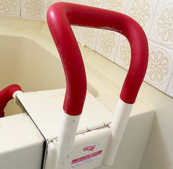 ちなみに、お風呂のフチの右端には、一番最初に脳梗塞をやったときに取り付けてもらった手すりもあるんですよ。
