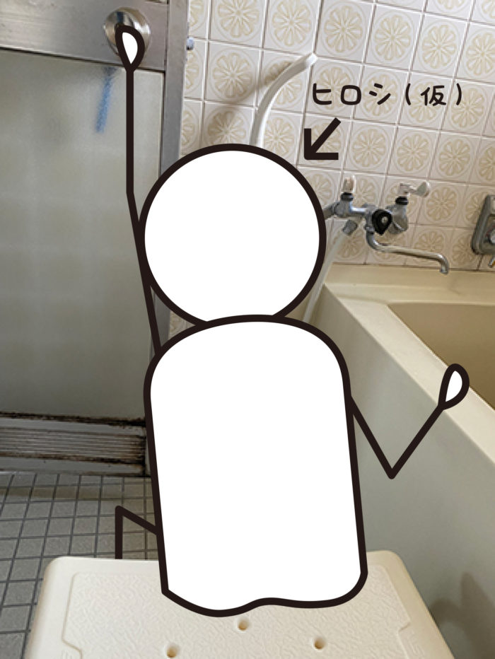 こんな感じの狭い風呂場なんですが。手前の椅子に座って立ち上がろうとします。