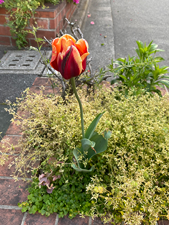 近所の歩道沿い花壇で咲いている「孤高のチューリップ」