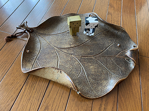 葉っぱの大皿は、机や棚の上に置いてトレーとして使うのはどうでしょう?