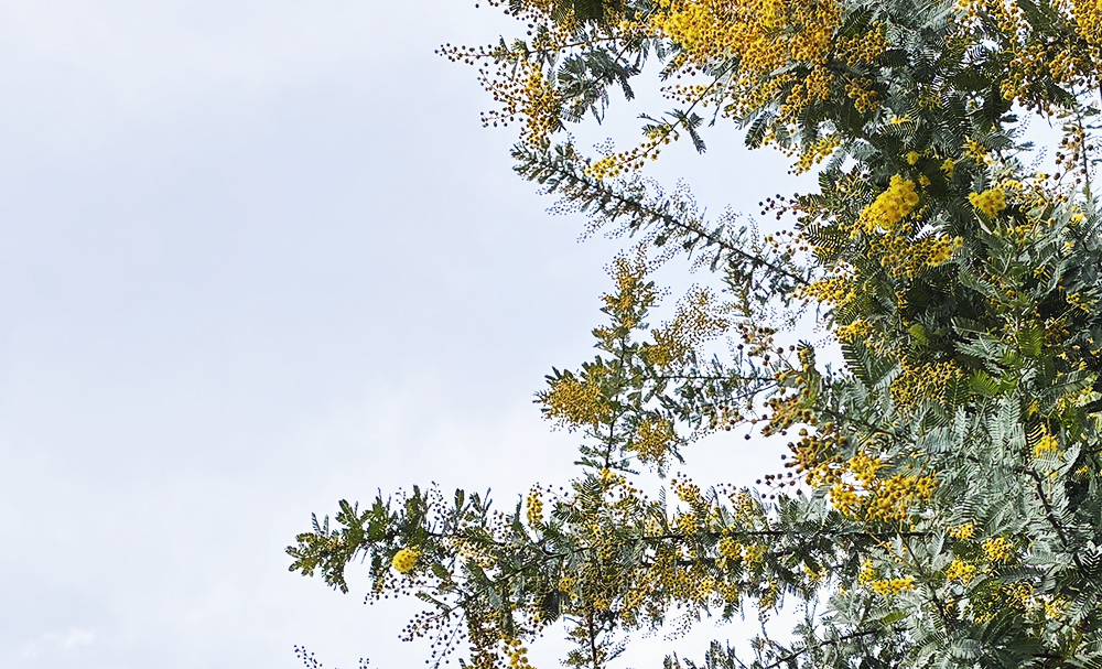 ご近所のミモザ、咲き始めました。